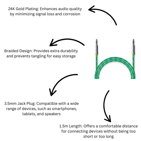 24K Gold Plated Braided Aux Cable 3.5mm Jack 1.5m Green