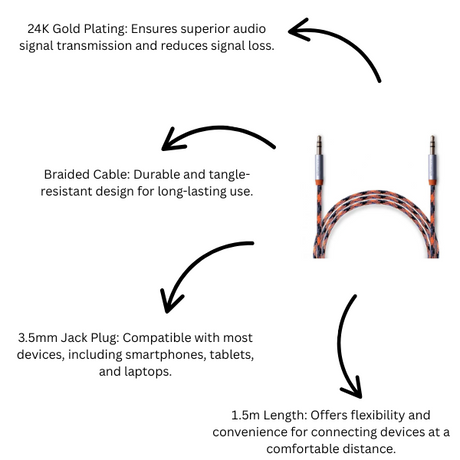 24K Gold Plated Braided Aux Cable 3.5mm Jack 1.5m Orange