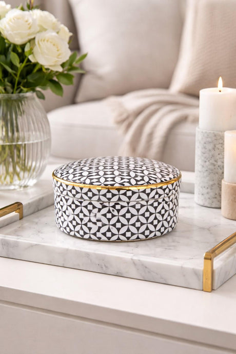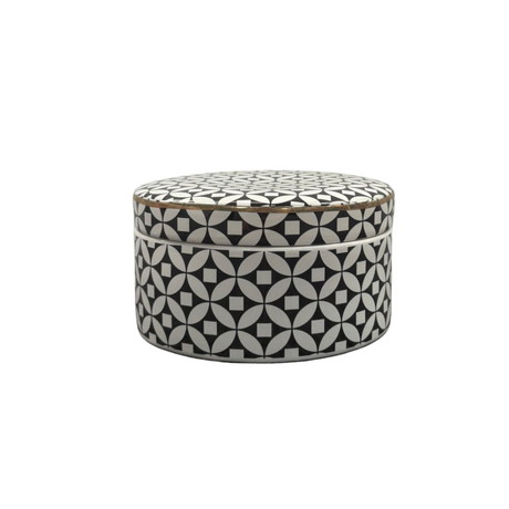 Black & White Geometric Lidded Jar 16.5cm Wide with Gold Rim