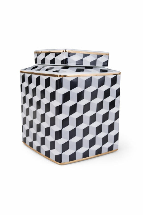 Black & White Geometric Lidded Jar 22cm Wide with Gold Rim